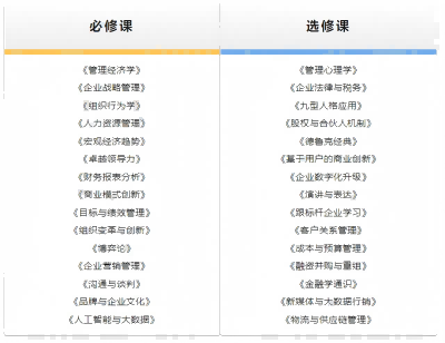 亚商学院工商管理课程必修课为15门,选修课为20多门。每一位进入亚商的学员,在18个月左右的学习生涯中,将至少修读20门课程,并完成一篇高质量的论文。共修满至少57个学分,才可以顺利毕业。
